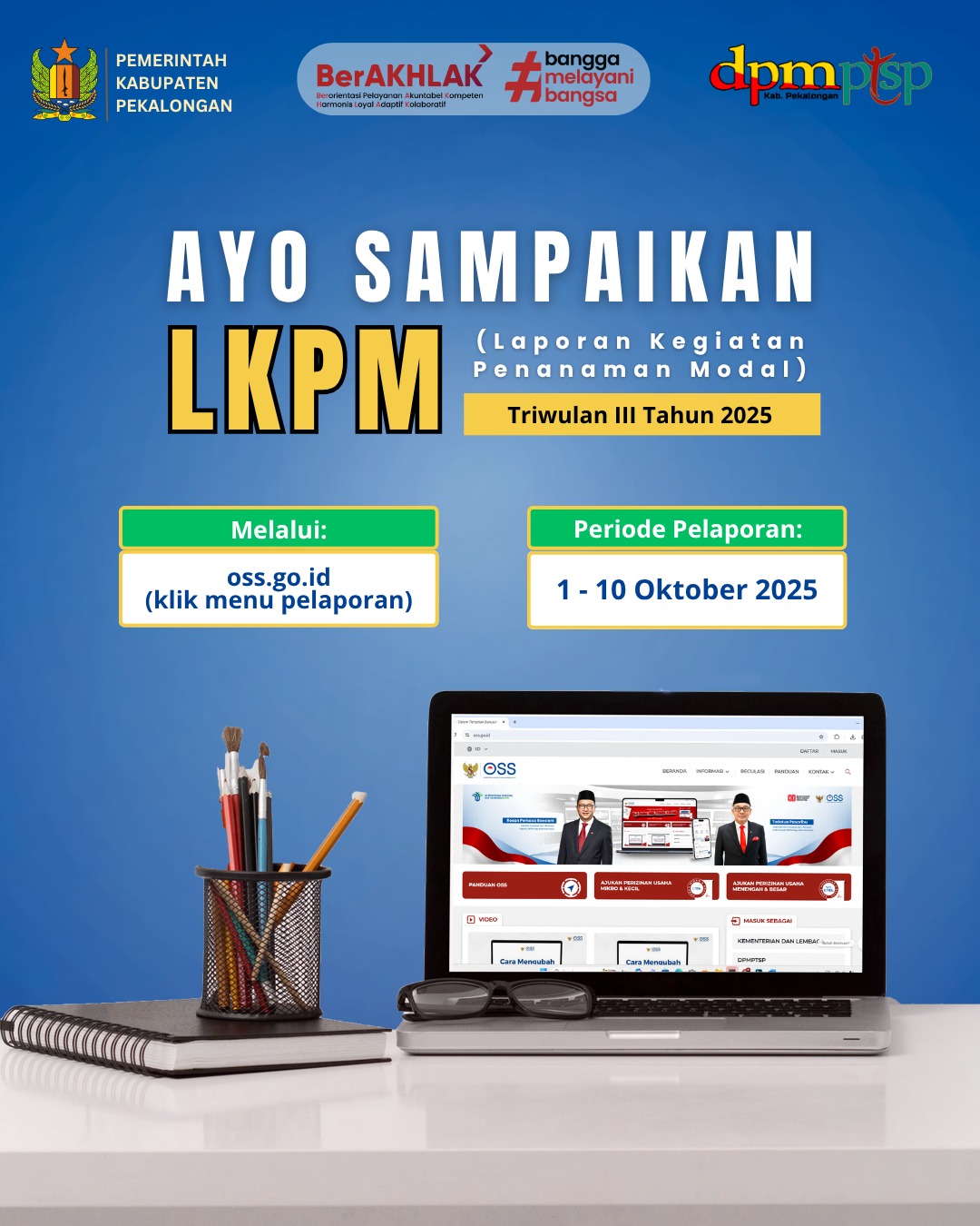 Penyampaian LKPM Triwulan 3 Tahun 2025 Admin Ptsp Berita 02 October 2025 Hits: 50 Hai Sobat DPMPTSP,Yuk sampaikan Laporan Kegiatan Penanaman Modal Triwulan 3 Tahun 2025 melalui Online Single Submission.Periode Pelaporan :1 - 10 Oktober 2025 Facebook Twitter Next